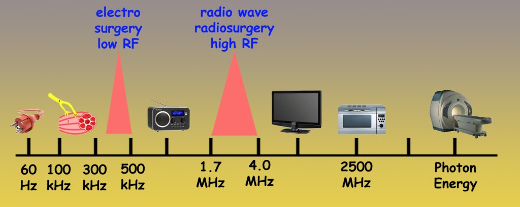 Electrosurgery requires an electrosurgical generator that changes the standard 50 or 60 Hz, low frequency electrical current into a useable high frequency 200 kHz to 5 MHz current. Since the neuromuscular system becomes refractory to electrical stimulation beyond a frequency of 100 kHz, there is minimal stimulation when using these high frequencies. The spectrum mentioned falls within the electromagnetic spectrum of low radiofrequency bands (AM broadcast signals 550-1550 kHz). Some units go as high as 3-4 megahertz (MHz) and occur in the range between AM and FM radio broadcasting. These are referred to as radio wave radiosurgery units (Figure 1).