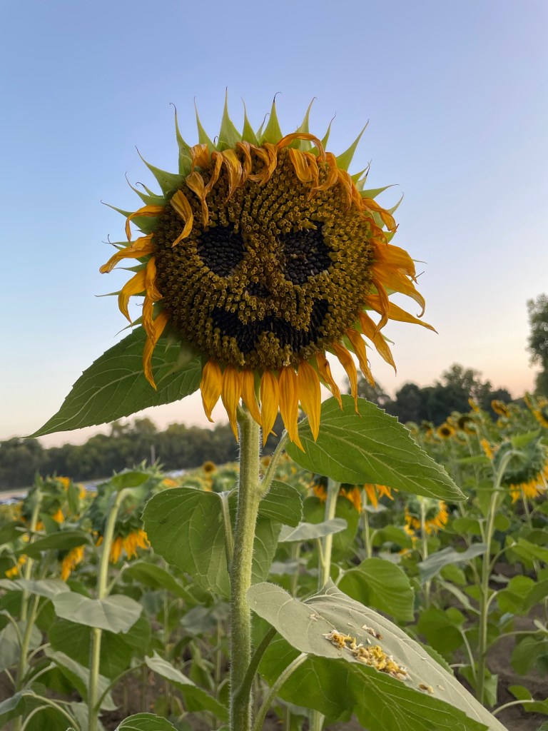 Ah, the end of August and the beginning of September—it’s Kansas Sunflower Parade time, folks! That magical moment when the fields around Lawrence burst into a sea of yellow. There’s this one farm, Grinters or sunflower central, where the blooms stretch as far as the eye can see. But, of course, this year, my globetrotting ways meant I was running a bit late to the party. So there I was, sneaking in one final sunset with the sunflowers—Chippie by my side, and a whole lot of droopy blooms that seemed to be nodding at me like, “Yep, we had a good run, didn’t we?”