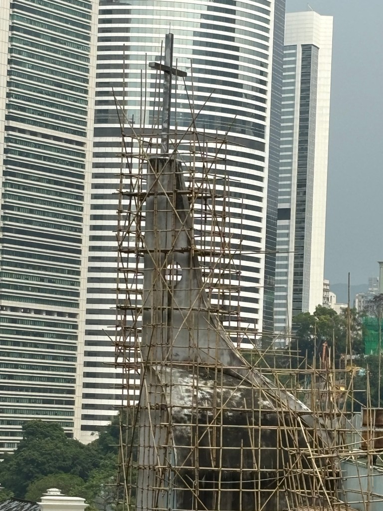 As we begin the walk down, it’s striking how the cool breeze at the top quickly turns into sweltering heat as the path steepens. One thing that never fails to amaze me is the bamboo scaffolding. These towering high-rises are wrapped in what looks like a delicate web of bamboo, and the fact that workers brave those flimsy-looking platforms—dangling off the 40th floor—blows my mind. “It’s very sustainable,” my travel companion notes. “Yes, until you realize they’re held together by millions of plastic zip ties,” I reply, waving goodbye to that eco-friendly dream. But, on the bright side, during a hurricane—or a “cyclone,” as they call them here—the bamboo barely causes any damage when it’s torn away. A silver lining, I suppose!