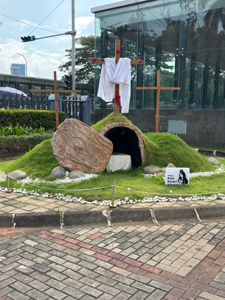 Outside, there’s a small hill with three crosses and a stone dramatically rolled to the side—which, let’s be honest, probably moonlighted as part of a Pesach-themed stage set at some point.